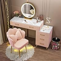 | 9 | VTELGT Velvet Upholstered Dressing Table with Padded Chair, Modern Vanity Desk with LED Mirror, 3 Light Modes, 5 Drawers, Marble Tabletop Makeup Table for Girls Bedroom,Pink